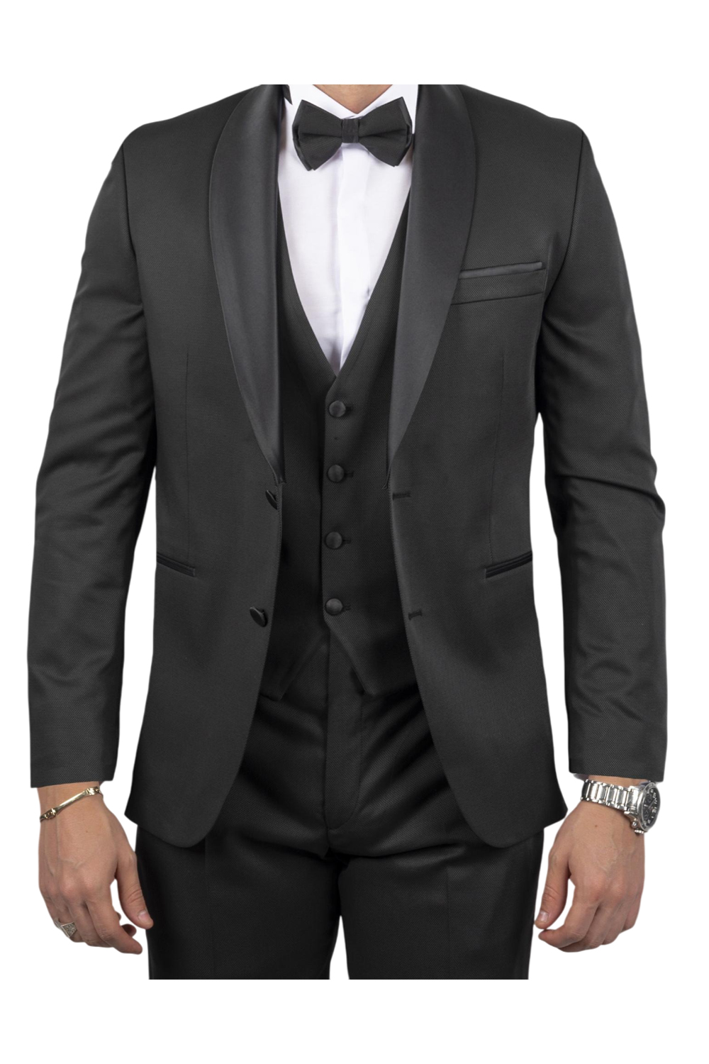 - Με αποσπώμενο σμόκιν, πέτο και παπιγιόν