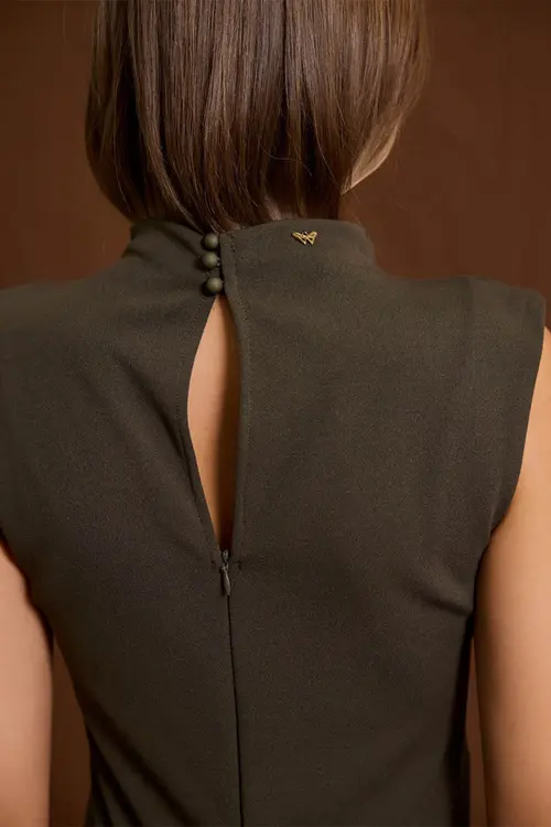 - Κρυφό φερμουάρ πίσω και κλείσιμο με κουμπάκια.