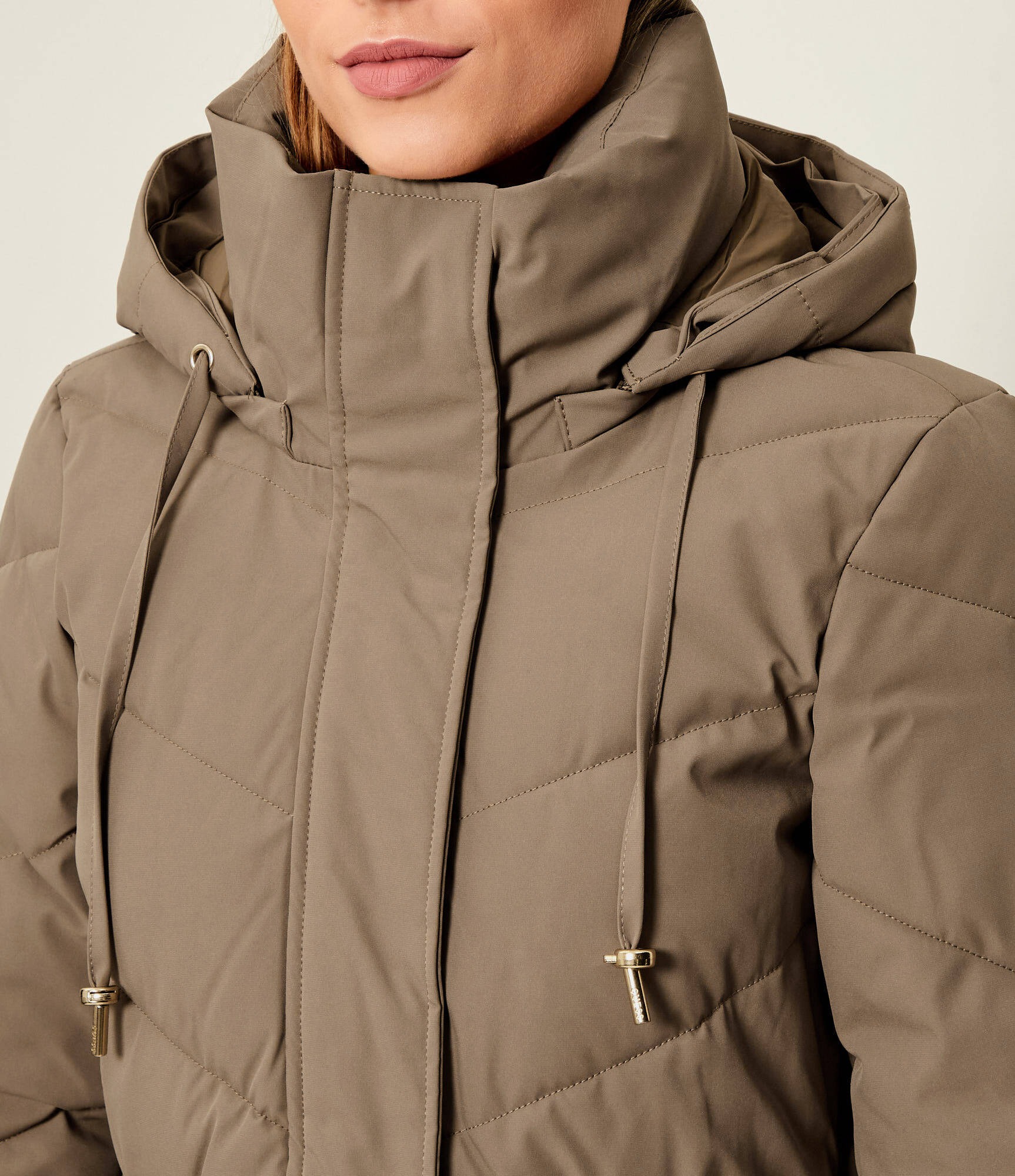 - Μακρύ φουσκωτό μπουφάν από συνθετικό ύφασμα.