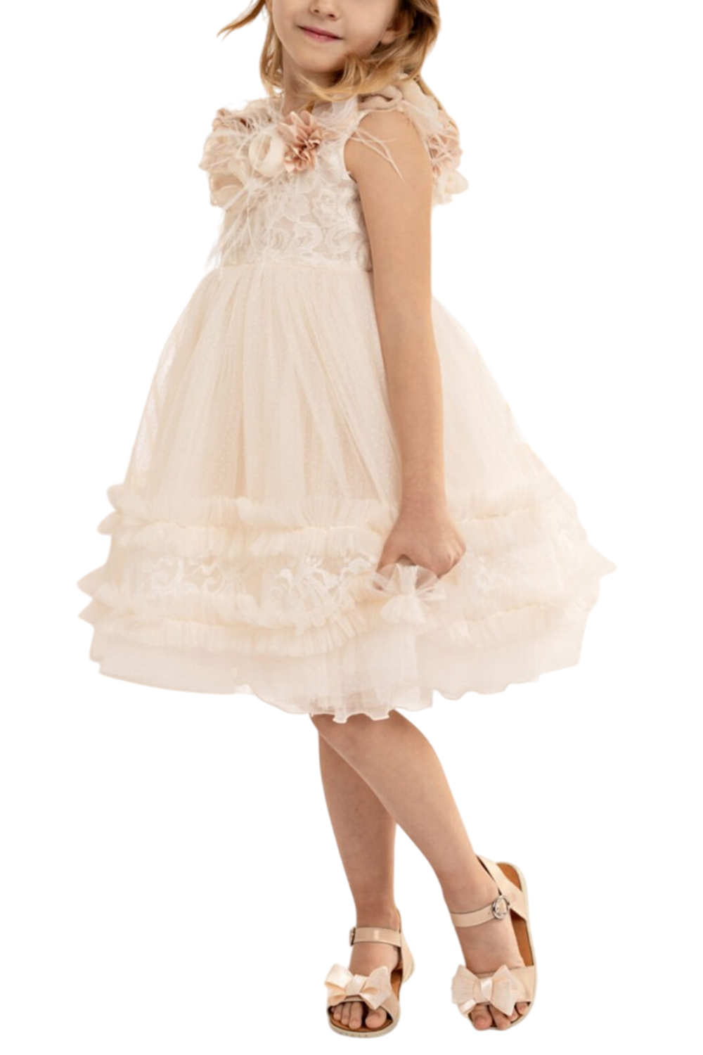 - Η φούστα, με την πλούσια σούρα από απαλό τούλι και δαντέλα, κινείται με χάρη και ελαφρότητα, ενώ μια σειρά από μικρά βολάν προσθέτει μια παιχνιδιάρικη, ρομαντική πινελιά.
