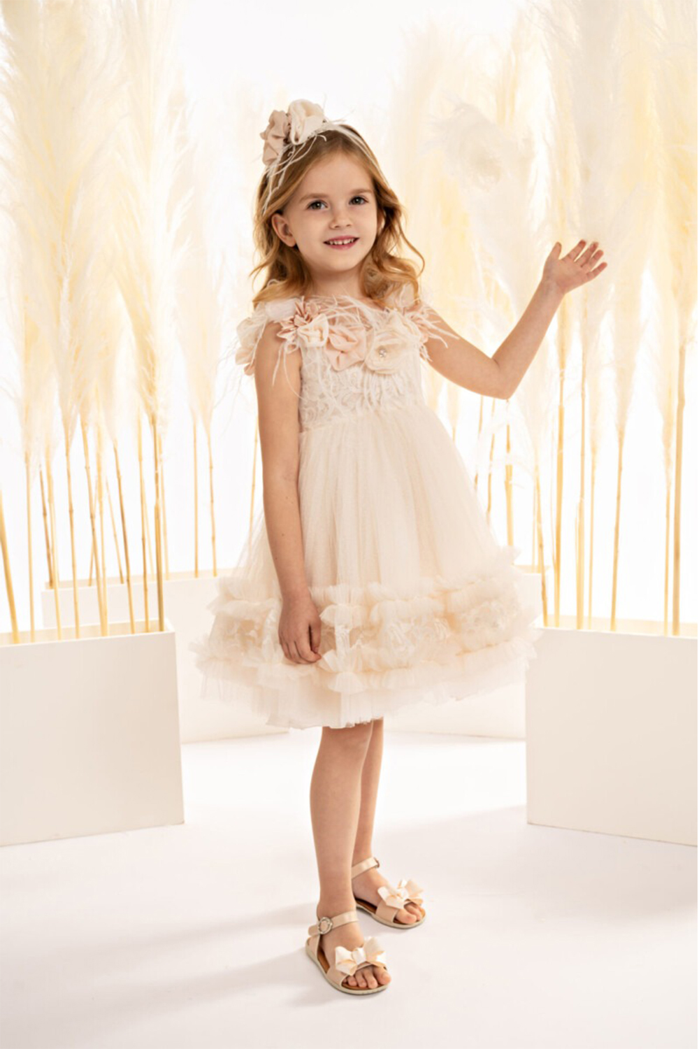 - Η εμφάνιση ολοκληρώνεται με κορδέλα για τα μαλλιά, διακοσμημένη με τα ίδια φίνα λουλούδια και φτερά, συνθέτοντας ένα σύνολο που θυμίζει παραμυθένιο όνειρο.