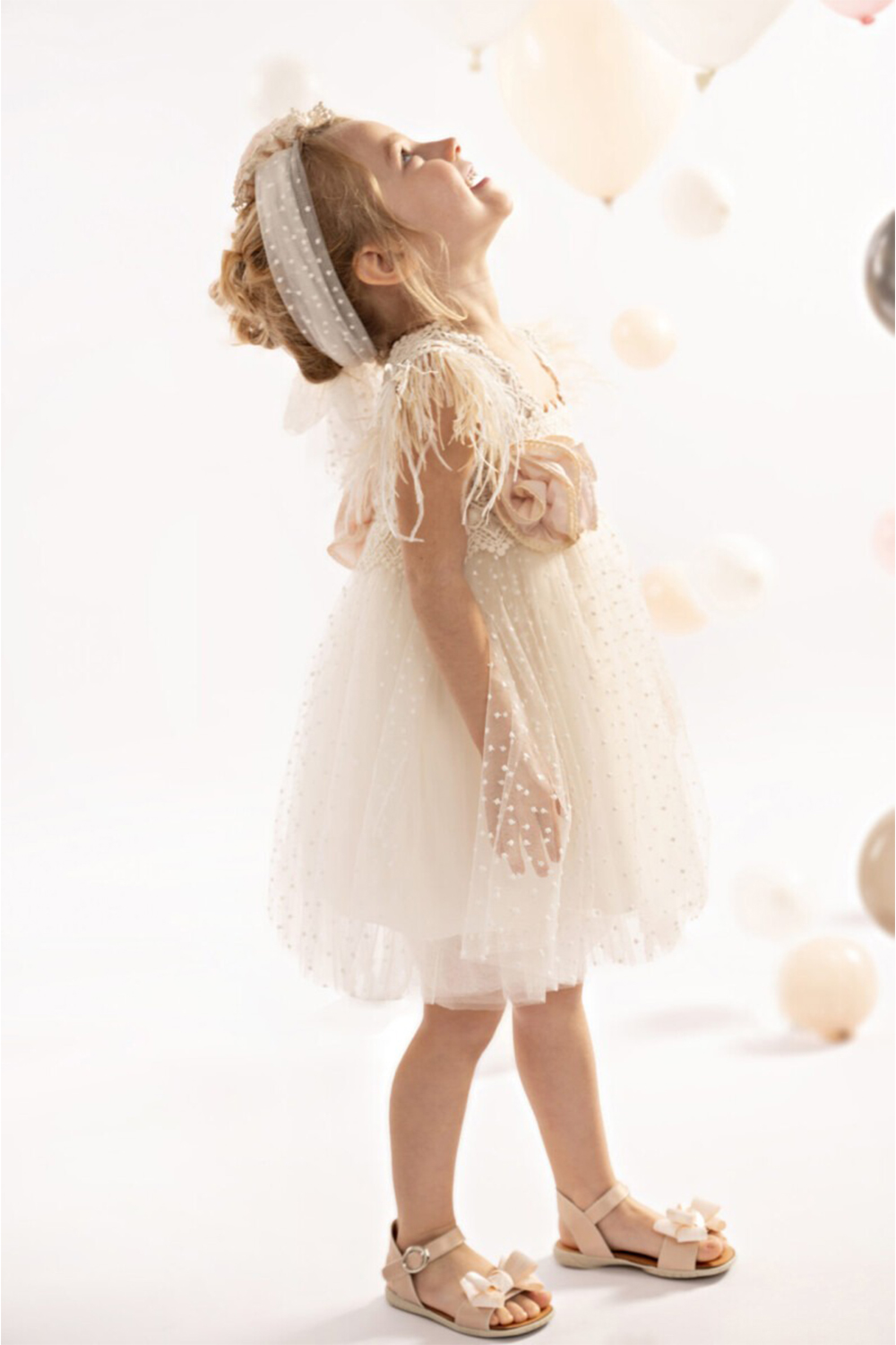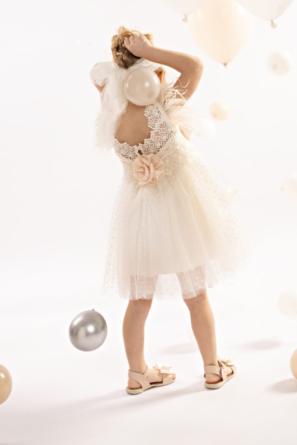 - Το σύνολο στολίζεται με δύο μεγάλα διακοσμητικά χειροποίητα λουλούδια μπροστά και πίσω στο μπούστο σε Εnglish rose χρώμα, τα οποία στολίζουν και την κορδέλα στο κεφάλι, δημιουργώντας μία ονειρική εικόνα.