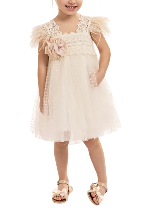 - Ένα μοναδικό boho φόρεμα σε εκρού χρώμα με μπούστο από μακραμέ δαντέλα, με υπέροχη «v» πλάτη, φαρδιές τιράντες και φτερά στρουθοκαμήλου, που προσδίδουν μία αίσθηση εκλεπτυσμένης φινέτσας.